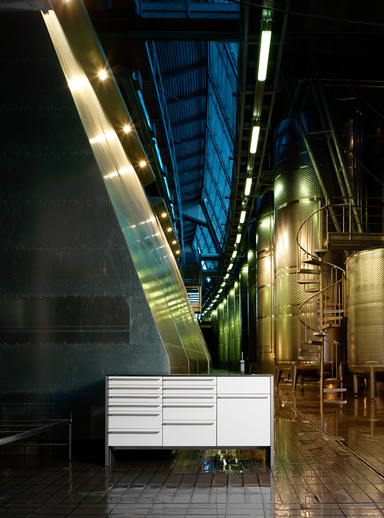 Un altro esempio. Un’azienda di apparecchiature per dentisti vuole comunicare il proprio prodotto (un mobile dal design minimale) veicolando il valore della tecnologia. L’essenzialità del prodotto non racconta immediatamente questa storia quindi abbiamo pensato di fotografarlo in un contesto completamente diverso, un ambiente in cui non si sarebbe mai trovato: l’ambiente di fermentazione (uno spazio molto tecnologico) di un’azienda di vini. Il prodotto bianco e grigio è posto ai piedi di una grande sala dove abbiamo fatto risaltare i colori dal blu al verde e acciaio.